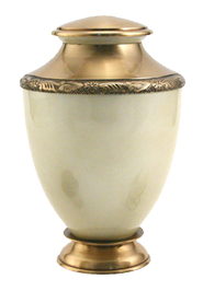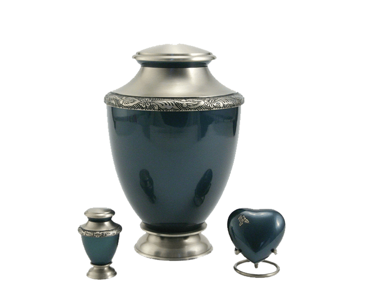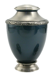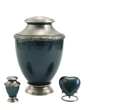 The Eternity Urn Series features a classic urn design with elegant hand-engraved edging and a delicate metallic luster finish. The main portion of the urn is constructed of aluminum and the upper portion, lid and base are made of brass. The Pearl urn is offered in a pearl white finish with brass trim and the Indigo urn is offered in a deep blue finish with pewter trim. A matching keepsake urn and heart keepsake are available. Heart stand is available.