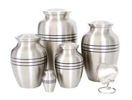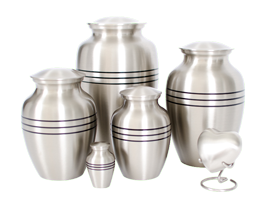 The Traditional Nickel Urn is made of brass and is electroplated in nickel using a sand casting process that is hundreds of years old. . The urn is offered in a brushed nickel finish with three black antiqued lines that encircle it with detail. A matching keepsake urn and heart keepsake are available. Heart stand is available.