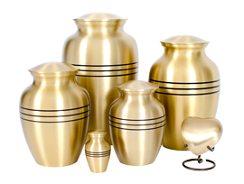 The Traditional Bronze Urn is made of brass and is individually handcrafted using a sand casting process that is hundreds of years old. The urn is offered in a brushed bronze finish with three black antiqued lines that encircle it with detail. A matching keepsake urn and a heart keepsake are available. Heart stand is available.